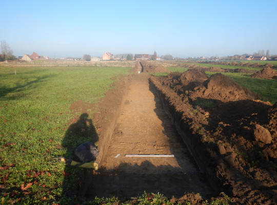 “Er werd een archeologisch vooronderzoek uitgevoerd en nadat een landschappelijk booronderzoek gedaan werd, bleek een proefsleuvenonderzoek noodzakelijk. Het onderzoek leverde enkele vondsten op”, zegt schepen van erfgoed Kurt Himpe. “Er werden twaalf proefsleuven uitgevoerd zodat ongeveer tien procent van het gebied archeologisch onderzocht werd. Er werden een vermoedelijk brandrestengraf, houtskoolmeilers, een bijkuil, paalkuilen, grachten en greppels aangetroffen. De meeste grachten kunnen tot de postmiddeleeuwse tot de recente tijd teruggebracht worden, maar de overige sporen wijzen in de richting van de Romeinse tijd. Er loopt nu verder natuurwetenschappelijk onderzoek dat een meerwaarde kan zijn voor de aangetroffen sporen en voor de geschiedenis van onze stad”, verduidelijkt erfgoedschepen Kurt Himpe.