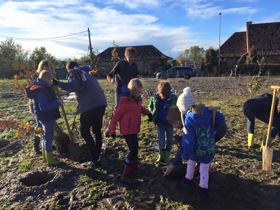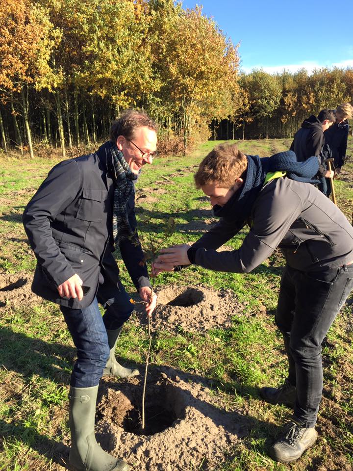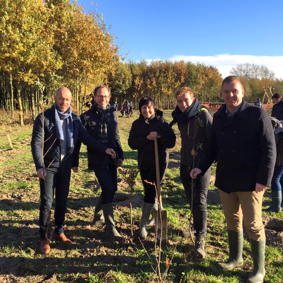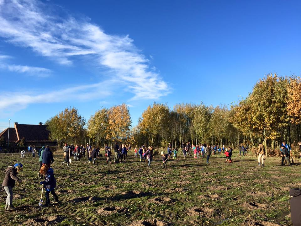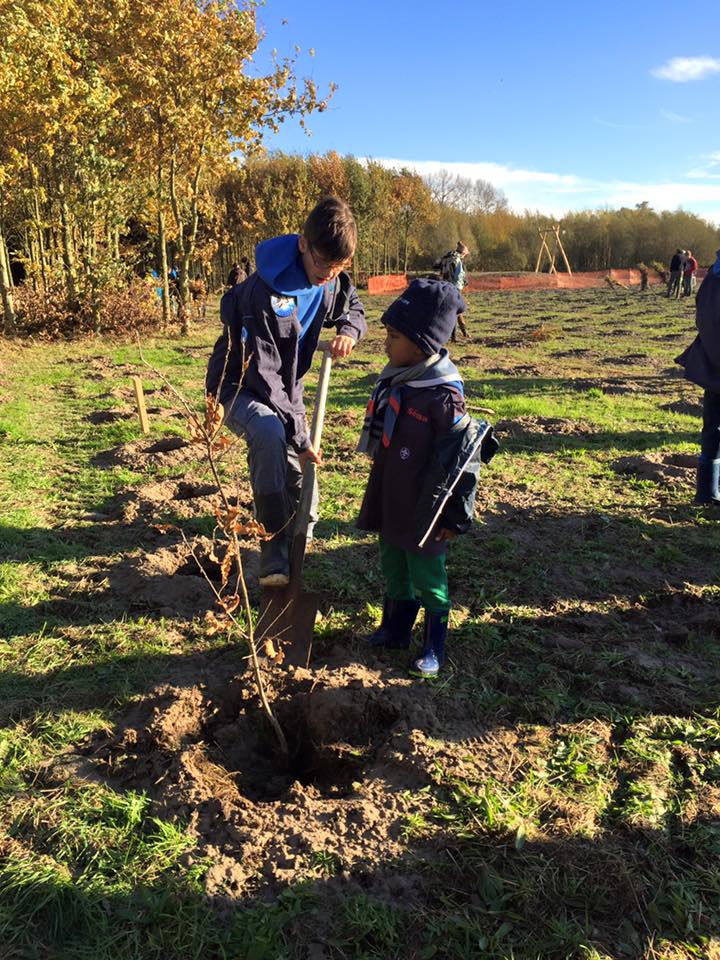 Samen met een stevige delegatie schepenen, de scoutsleden van het FOS, de Karekietjes en andere vrijwilligers plantte Bert Maertens op de Dag van de Natuur jonge eiken in het speelbos van het prachtige kasteeldomein Wallemote.