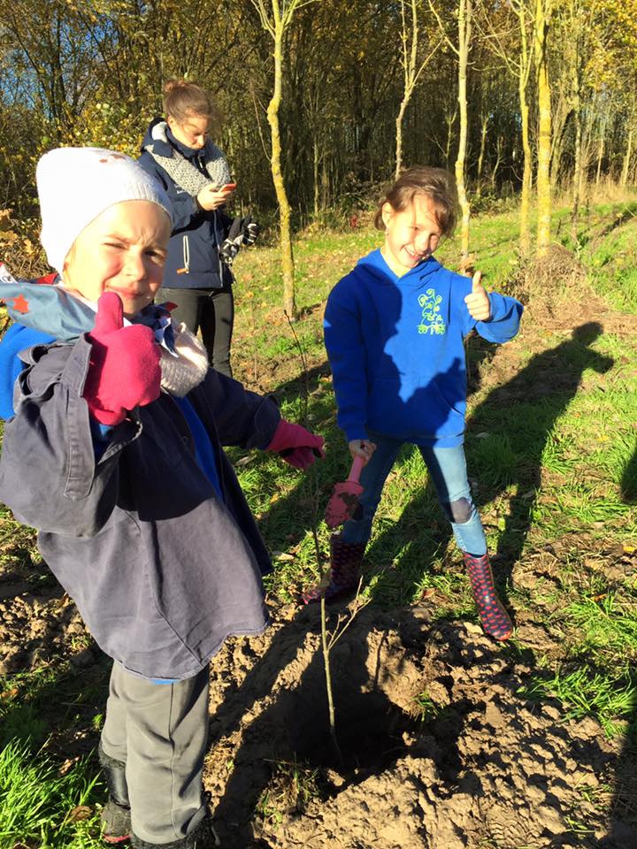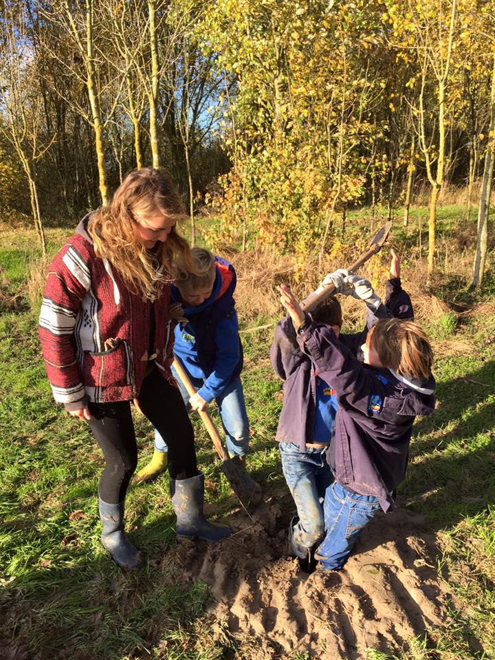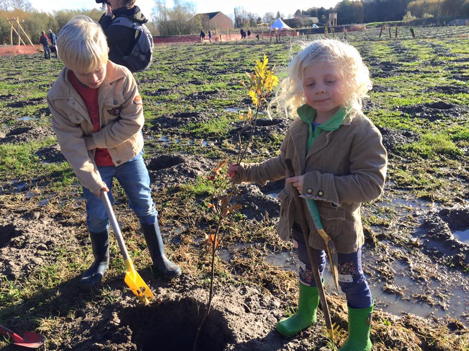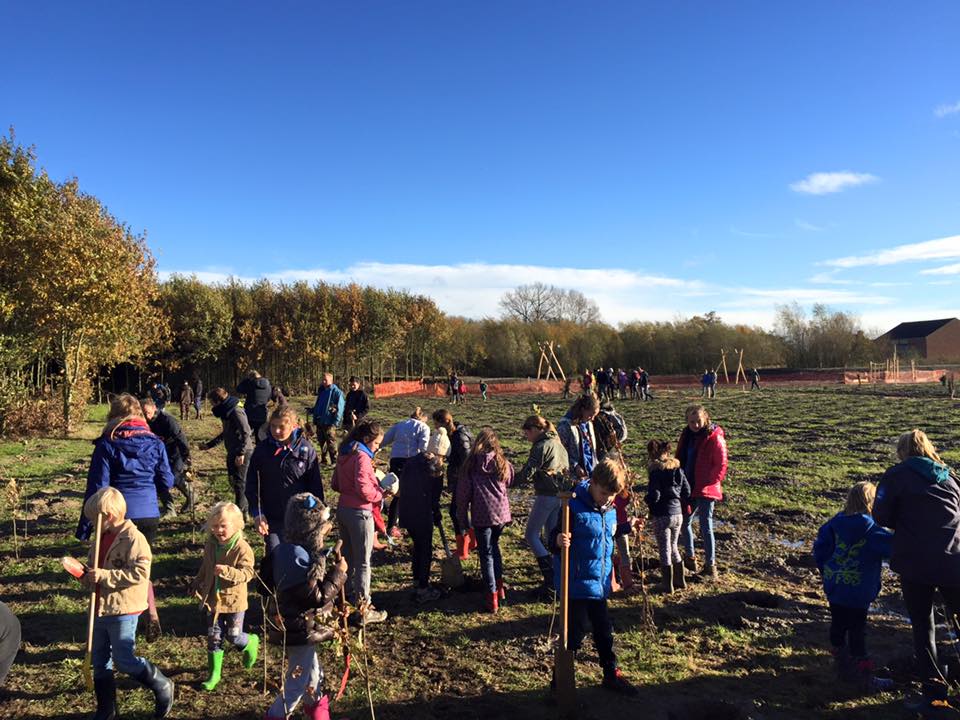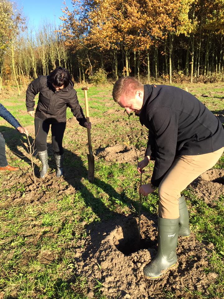 Samen met een stevige delegatie schepenen, de scoutsleden van het FOS, de Karekietjes en andere vrijwilligers plantte Bert Maertens op de Dag van de Natuur jonge eiken in het speelbos van het prachtige kasteeldomein Wallemote.