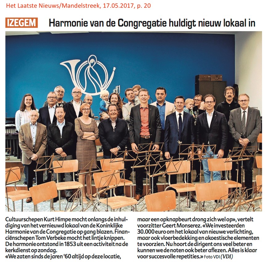 IZEGEM - Cultuurschepen Kurt Himpe mocht onlangs de inhuldiging van het vernieuwd lokaal van de Koninklijke Harmonie van de Congregatie op gang blazen. Financiënschepen Tom Verbeke mocht het lintje knippen. De harmonie ontstond in 1853 uit een activiteit na de kerkdienst op zondag.